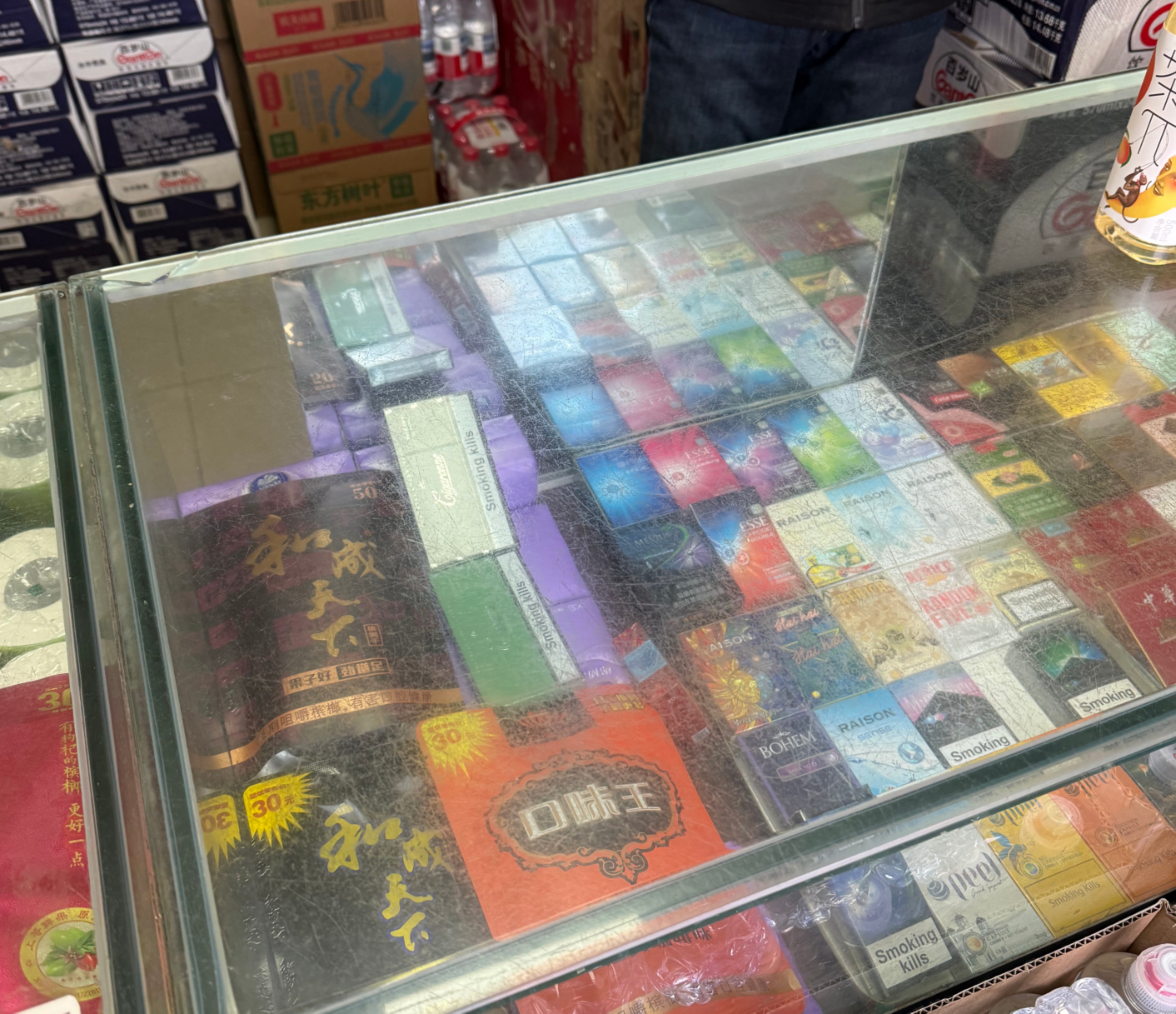 北京市第五中学分校(鼓楼校区)地处闹市,孩子们放学后总会被周边各种店铺吸引。出了校门往东,离学校最近的一家便利店大门上标着“名酒”。这家店空间不大,赶上放学高峰,一个个来买饮料、买零食的“大书包”挤在店里转不开身。穿过人群,烟草柜台赫然出现在眼前。玻璃罩子里的香烟琳琅满目。