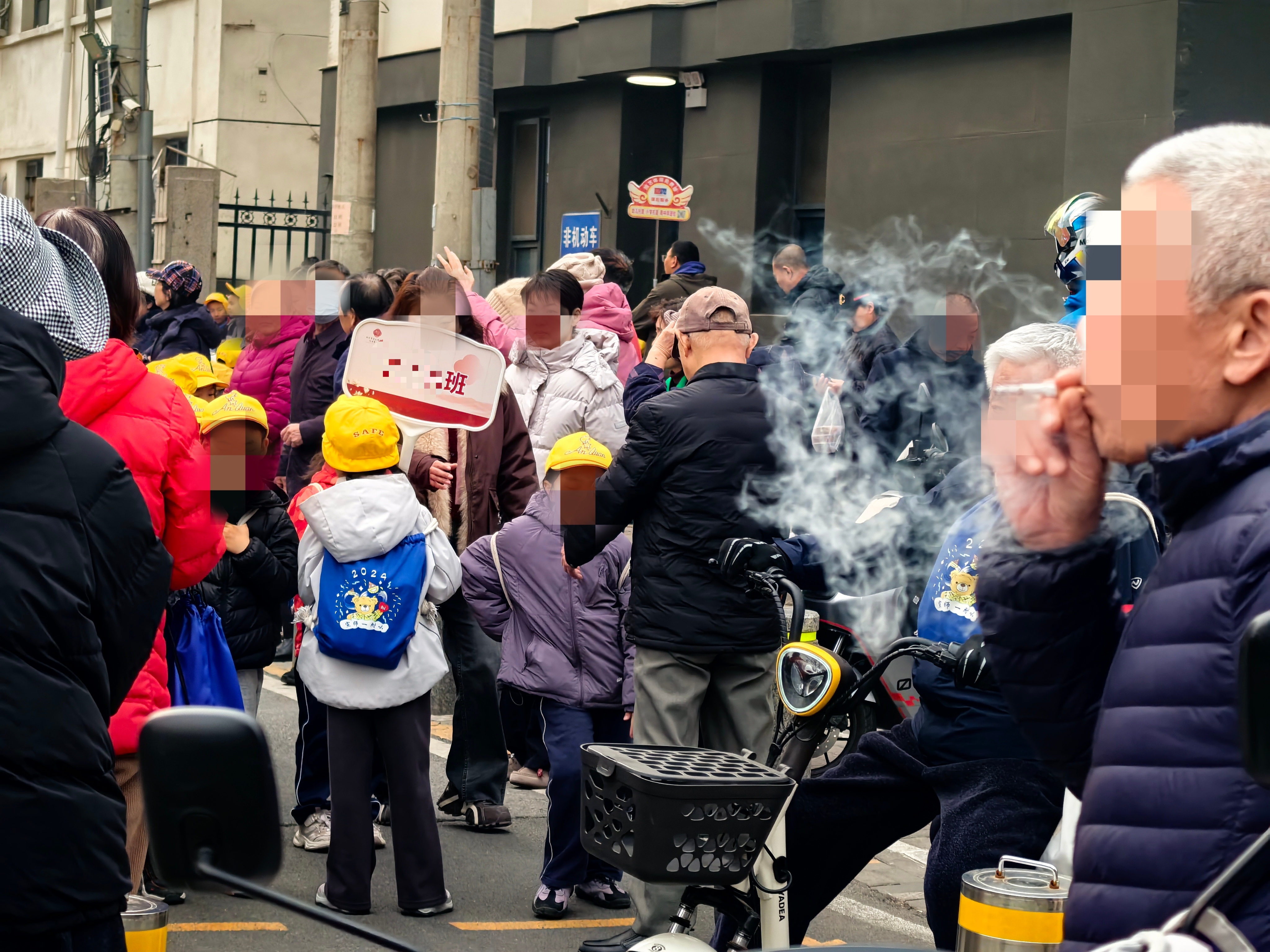 放学期间,有家长在学校门口等候区吸烟。