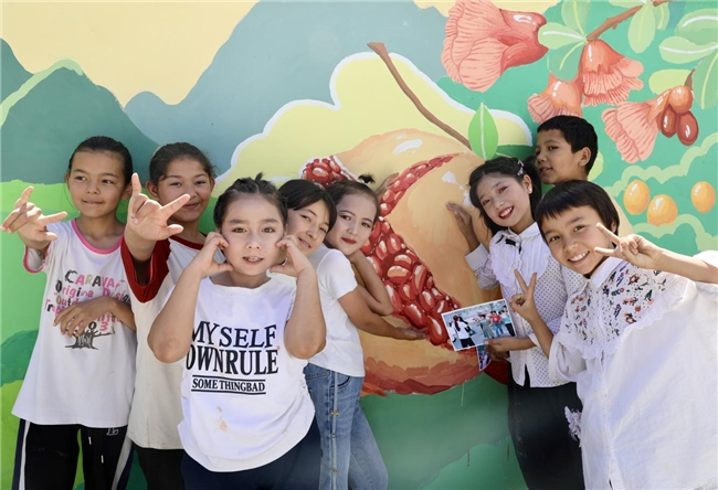 塔什米里克乡青少年在实践团创作的民族团结主题墙绘前争先合影