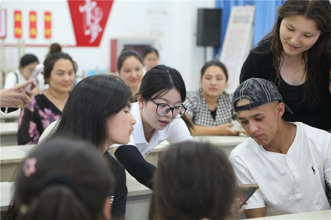 实践团成员与塔什米里克乡青少年共同主持成果汇报展演